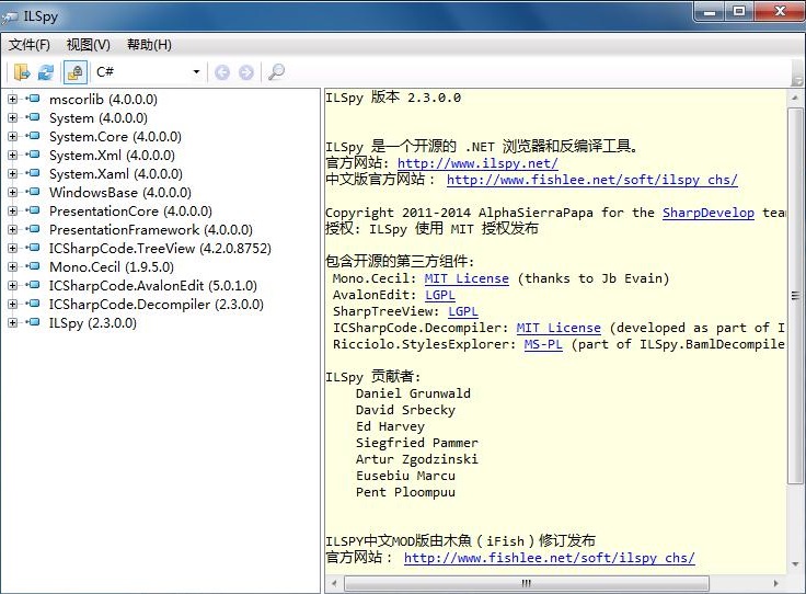 ilspy中文版是一款强大的反编译工具,主要针对.net平台的各类软件进行反编译,能够轻松反编译C#和VB语言的程序,软件本身是C#程序,并且完全免费,是一款开源软件,如果用户懂得编程的话,能够自己进行扩展和修改,使得软件更加强大。