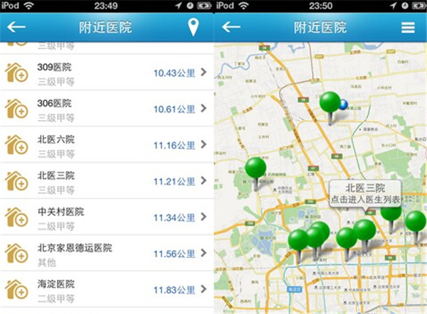 附近医院:附近医院是基于LBS的医院查询功能,功能较为简单提供基于用户地理位置的医院搜索及路线查询功能,功能没有特别出色的表现,体验较为中庸。