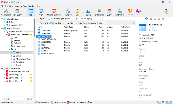 Navicat for Oracle官方版是一套专为 Oracle 设计的强大、优秀的oracle数据库管理软件。Navicat for Oracle可用于任何数据库服务器,并支持大部分Oracle功能,包括目录、表空间、同义词、实体化视图、触发器、序列、类型等等。并且Oracle可让你简便地以安全且简单的方法创建、组织、访问和共享资讯及进行 Oracle 的管理!Oracle除了核心功能外,它还为用户提供了一些丰富的增强功能,包括数据模型工具、数据或结构同步、导入或导出,令数据维护更容易!