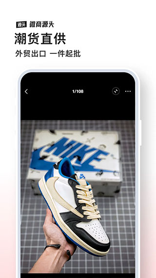 【共享货源】【微商相册1688阿里巴巴】 找货、分销、分享、高效转发铺货等货源展示。 热门爆款、莆田运动鞋、男装、女装、彩妆、电子数码、手表、鞋厂。 【货源市场】【微商好货源】 每日必抢商品3折封顶。 大牌品牌尾货,1折起售。 工厂源头货源,自购省钱,卖货赚钱。 上新潮牌实时更新,全球限量款同步销售。 【全面服务】【微商码头】 海量源头货源,一件代发 48小时发货(部分商品除外,具体以商家页面信息为准,添加商家微信咨询)面单保密 微商水印 设立独家网站、短视频自媒体运营推广同时与微商、电商相册APP深度合作。微商源头app使用指南