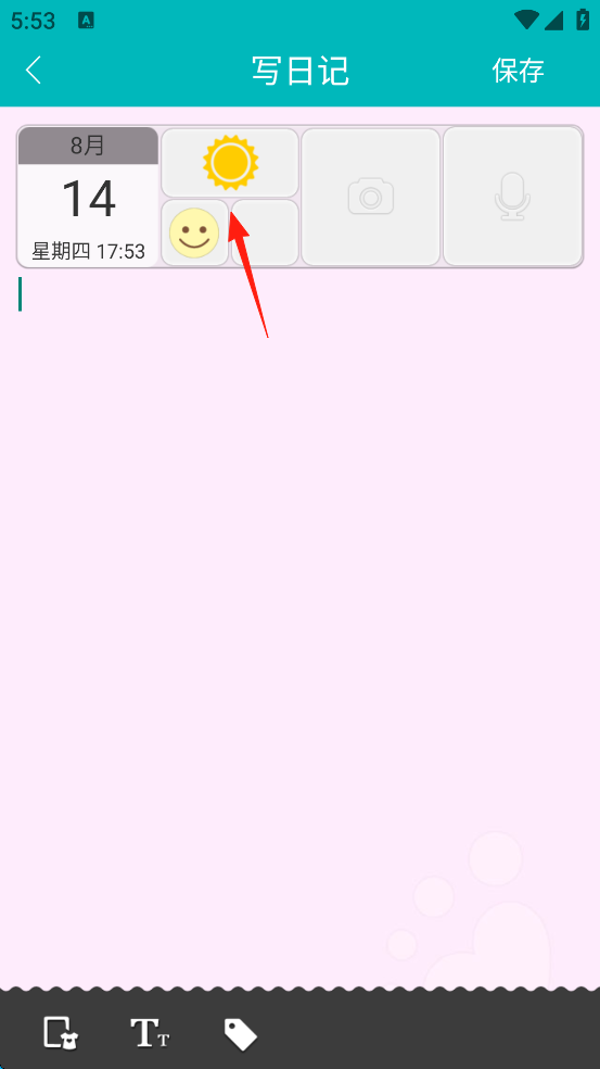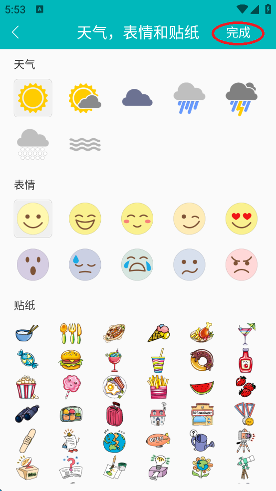 4、点击贴纸处可以多设置贴纸表示天气、心情等等。
