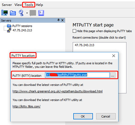 1、将MTPuTTY和Putty关联起来 打开MTPuTTY,进入Tools->PuTTY location,选择上面putty的安装目录即可。
