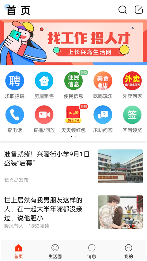 1、进入长兴岛生活网app软件后,找到【首页】,我们就能看到一些常用功能,如求职招聘、房屋租售、便民信息等。