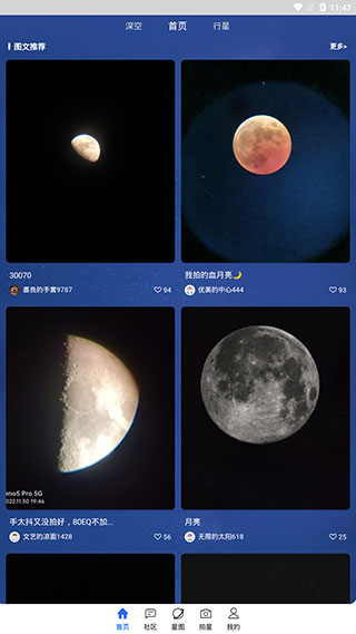 对于一些拍摄优秀的星空照片,我们滑动到【首页下方】即可进行查看,点进详情还可进行点赞评论等互动。