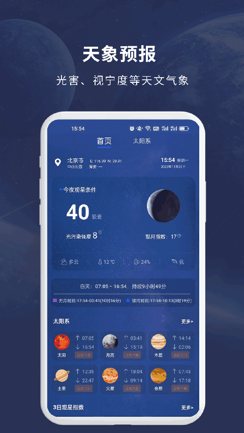 1、怎么查看观星条件? 进入软件【首页】之后,我们就能很直观地看到未来几天内的观星条件,然后就可以根据此条件调整自己的观星计划。
