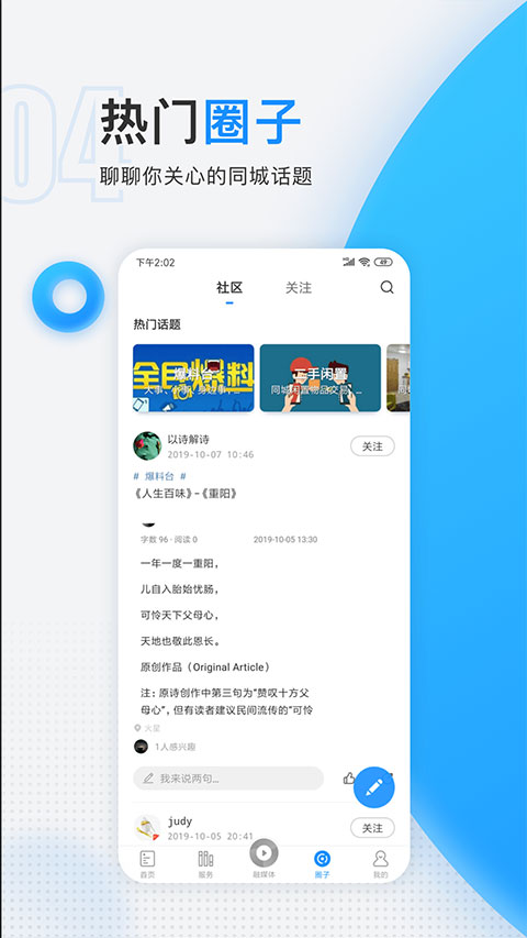 1、新闻阅读功能 可让用户在线阅读最新的新闻资讯内容; 2、天气查询功能 可让用户一键查询当地的天气状况; 3、活动报名功能 可让用户在线快速的报名参加各种活动; 4、生活缴费功能 可让用户在线清缴水费、电费以及燃气费等等; 5、公交查询功能 可让用户查询实时公交以及公交的路线; 6、二手交易功能 可让用户在线进行各种二手产品的交易。更新日志