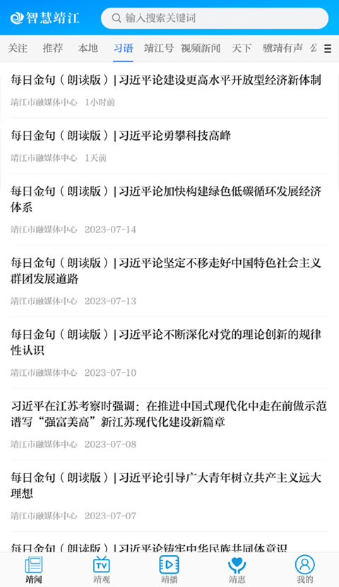 1、【靖闻】推荐、本地、习语、骥靖有声、马洲e评… 各类新闻栏目应有尽有,身边事天下事尽在掌握. 2、【靖观】容视频、靖听、电视、广播… 视听刷刷刷,根本停不下来。 3、【靖播】骥直播、主播秀 … 大型活动、新闻现场、在线访谈现场直播,还能互动抽奖,主播和你零距离。 4、【靖惠】面向靖江市民提供各类政务服务、交通出行、便民服务、医疗健康与人才服务等,线上能查能办的事咱绝不跑断腿。 5、【我的】注册登录、我的评论、收藏、留言、积分、订单、活动、爆料、订阅等等所有与我相关的,这是咱的隐私不要随便给别人哦。智慧靖江App使用教程