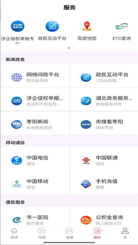 【新闻政务】 1、网络问政平台 2、政民互动平台 3、涉企侵权举报专区 4、湖北政务服务网 5、枣阳新闻 6、央媒看枣阳 【移动通信】 1、中国电信 2、中国联通 3、中国移动 4、手机充值 【便民服务】 1、市一医院 2、公积金查询 3、文明实践 【交通出行】 1、百度地图 2、代驾 3、ETC查询 4、违章查询更新日志