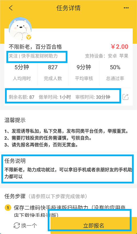 2、查看项目的要求、做单时间以及审核时间等,点击立即报名。