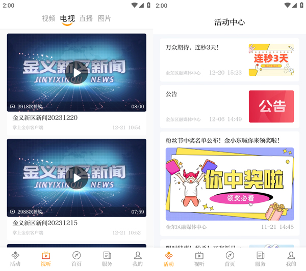 掌上金东APP改版升级啦!改版后,“掌上金东”客户端在底部设置了活动、视听、服务等版块,对精品视频、专题栏目节目以滚动的方式呈现给受众,为用户提供更精细化新闻服务。“活动”在首屏醒目位置呈现,可以让用户更加直观地了解最新活动讯息,提升活动参与感。