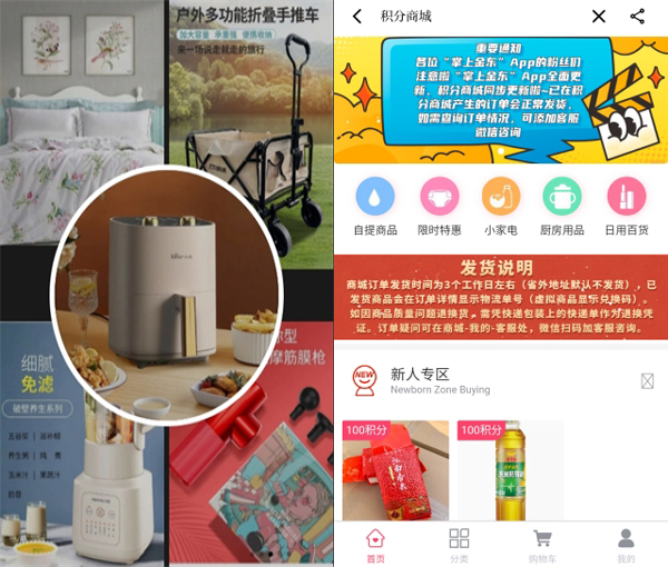 新版客户端积分商城商品也将同步上新,用户可按需进行选购,依然是无需花一分钱,空气炸锅、电饼铛、电火锅、破壁机、野营推车、蚕丝被、筋膜枪等一系列商品即可包邮到家!