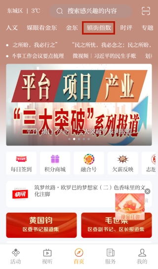 回到应用首页,滑动上方标题栏,找到“街镇指数”,点击进入。