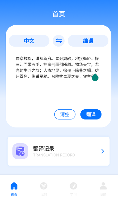 维语翻译官是一款在线翻译APP,提供维语与中文两种语言之间的翻译服务,用户只需输入需要翻译的文字,点击翻译即可快速语言转换。应用内还可以进行维语字母、单词、语句在线学习,进一步了解维语知识,帮助用户学习维语。