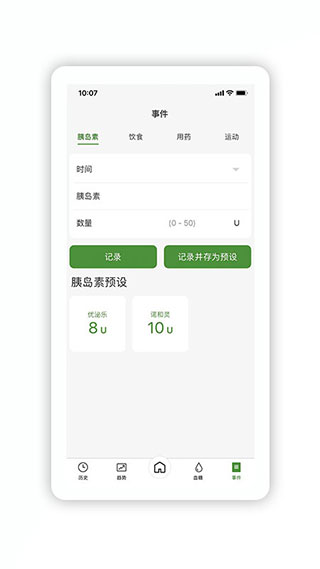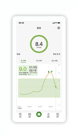 1、首页 首页显示当前血糖检测值以及该数值获取的时间,显示一段周期内(6小时或12小时或24小时)的历史血糖趋势 2、历史模块 该页面展示血糖提示信息、事件展示以及血糖记录数据 3、趋势模块 该页面为血糖浓度综合展示页,展示一段周期内(最近7天、最近14天、最近30天或者自定义选择时间段)血糖浓度的各项数值 4、血糖模块 该页面为血糖记录和校准页面 5、事件模块 该页面用户可以记录生活中发生会影响血糖浓度的事件。可以方便用户去管理自己的血糖浓度以及作为一个记忆存储的工具微泰动泰APP使用指南