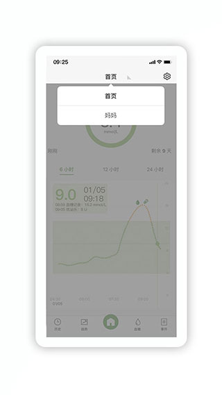 在首页的右上角,点击设置小图标进入设置页面,在设置页面点击“发射器”进入发射器绑定页面,输入持续葡萄糖监测系统设备上的SN码或扫描包装上的二维码绑定设备