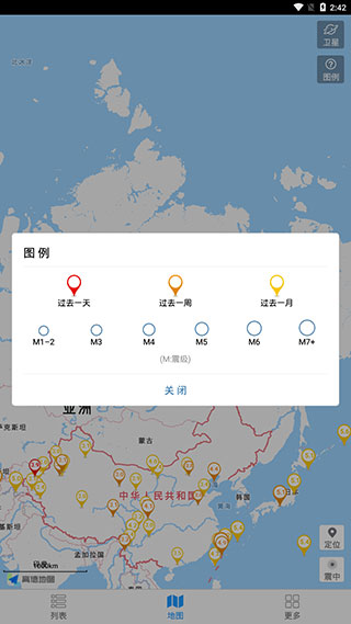 4、切换到【地图】页面则可以查看全球地震位置分布图,点击右上角还可以打开图例说明。