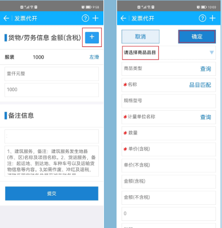 3、填写购买方、销售方基本信息。填写货物/劳务信息,点击右侧“+”号,进入填写界面。依次选择商品品目,点击查询商品类型,输入货物名称、计量单位名称、数量、单价等,确认后点击“确定”。