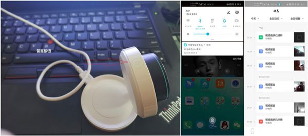 只需要点击小哨兵顶上的话筒按钮,小哨兵会提示使用者“请留言”,对着摄像机说话即可把需要表达的内容推送给APP,说完后再点一次话筒按钮即结束,这样APP使用者手机会收到小哨兵的信息推送,打开后可以播放留言内容,播放支持语音与画面的录像同时进行。这对于家里不会使用智能手机的老人和小孩来说,作为一个互动的工具确实比较实用!