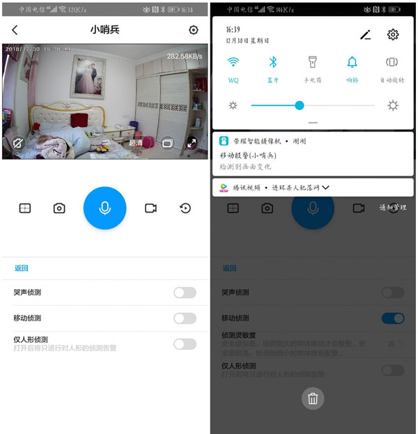 ②当然,还有移动检测,当你不在家的时候,如果家里没人打开小哨兵的移动检测功能,主要有移动物体在小哨兵拍摄的画面里经过,那么这时候小哨兵也会自动推送信息提醒家里的情况,打开小哨兵就可以看到家里的画面,这绝对的是防贼利器,即使是不法者发现摄像头破坏了设备,我们也可以从云模式里找到画面进行备案!