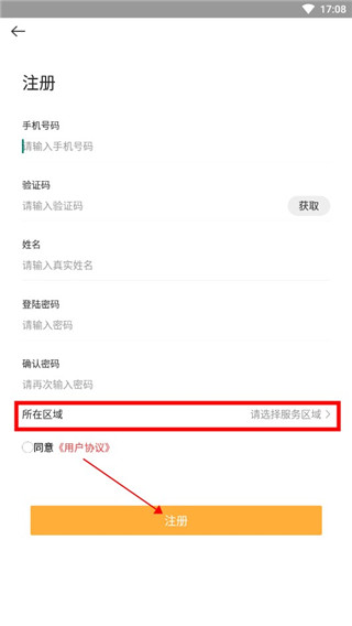 4、在这里输入的手机号、收到的验证码、真实姓名和密码,最后的所在区域一定要考虑好,错误的话对后续app的功能使用可能会有些麻烦。填好所有内容后点击【注册】即可。