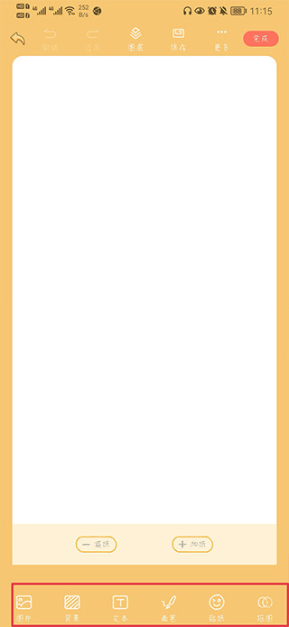 3、在下方工具栏中,可以添加图片、背景、文本、贴纸等,用来美化手帐。