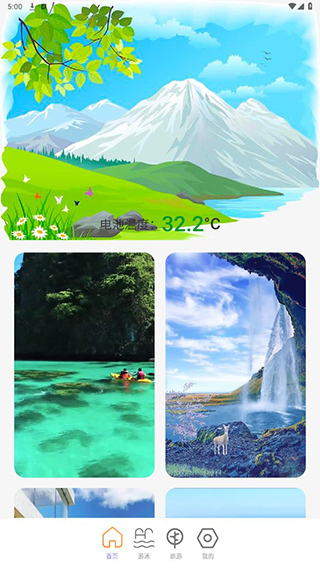 用户在下载并打开软件之后,会进入首页,会显示用户手机电池温度,以及有许多充电壁纸可以选择。