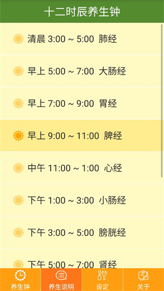 养生钟app,一般又称十二时辰经络养生钟。这是一款健康养生类软件,软件内依托中国最为传统的养生精髓,通过它可以让用户对于自身健康享有合理锻炼与规划,如早上7~9点是胃的养生期、凌晨1~3点是肝的养生期等等,用户可观察软件内对应时间点适宜做什么,禁忌做什么。