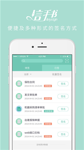 信手书APP官方版是一款由北京数字认证股份有限公司推出的掌上签名工具。随着时代在进步,越来越多的业务开始从线下转到线上了,很多业务还是需要用户的电子授权或者是签名才能够操作,而这款软件就能够帮助用户在手机上完成授权签名认证。该软件基于数字证书或数字证书扫描方式,可以帮助用户对通过系统授权的业务,进行签名认证。并且该软件签名具有法律效应,保证业务数据合法有效。同时信手书APP官方版软件还为用户提供了可设置管理的记住密码机制,可以帮助用户安心的进行工作,让您轻松进行签字,超级实用,有需要的用户快来下载体验一下吧。
