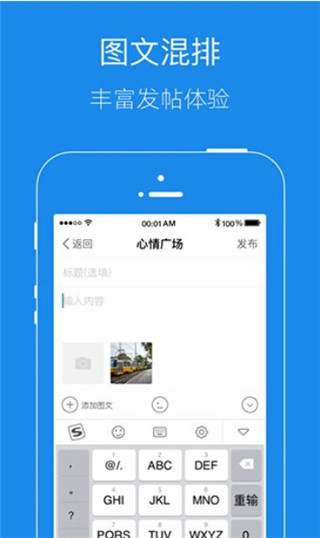 3、进入编辑页面,填写标题和内容,并且可以添加图文和表情,完成之后,点击右上角的发布即可。