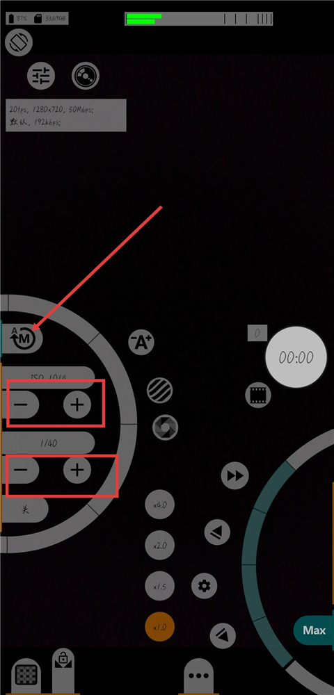 4、在手动曝光模式下,用户可以点击【+】、【-】来调节ISO和快门速度,也可以转动ISO轮盘来调节ISO。