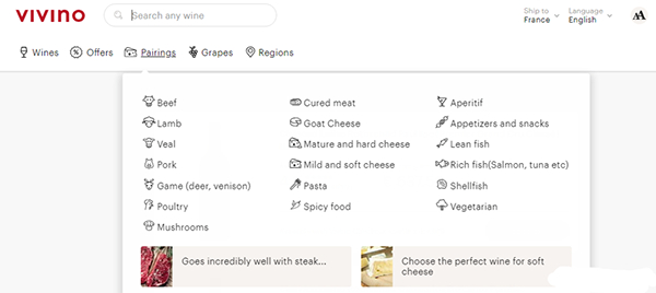 Vivino的推荐机制相比国内的电商平台更专业,更人性化。除了可以根据产区、品种、价位区间、评分、促销力度进行推荐外,还能根据配餐的食物进行推荐(类似于一个侍酒师的功能)。