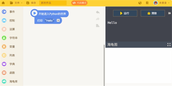1.海龟编辑器覆盖了python99%的功能。 2.可将python代码封装在图形化的积木脚本中。 3.积木脚本也可以随时转化成代码界面,学生可通过搭积木的方式来入门python学习。 4.支持一键安装第三方库、辅助安装python 3完成环境搭建。 5.支持硬件编程,同步学习物联网与开源硬件,并且内置智能纠错功能。 6.高中python新课标高考考点全部可在海龟编辑器中实现。 6.产品代码竞技场,可供学生在游戏化的平台学习编程、检验编程学习效果。如何使用海龟编辑器