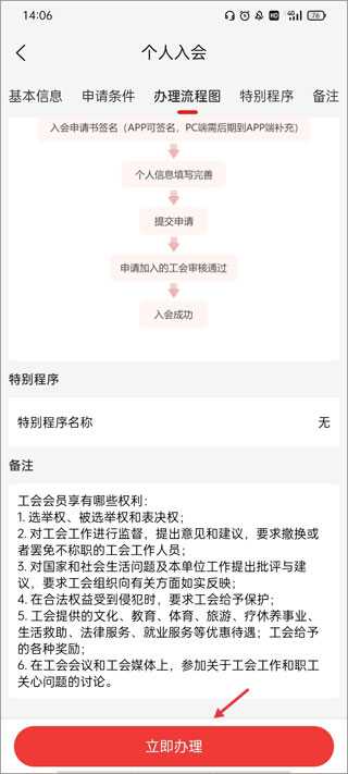 2、进入之后,大家可以先查看办理流程和备注,查看完成后,点击立即办理。