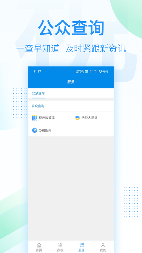 3、公众查询,一键查询税务信息,及时紧跟新资讯。