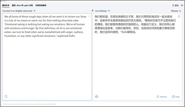 DeepL是一款来自德国的人工智能翻译工具,支持中文、 英语、德语等九种语言之间的全文翻译,其运行方式是利用人工智能技术和神经网络来不断训练和提升翻译能力。 1、支持文本英译汉 将要翻译的英语原文输入到区域内,之后机器翻译的结果就会出现在右侧框内,可以选择不同语言进行翻译。