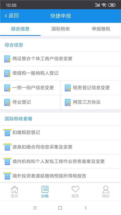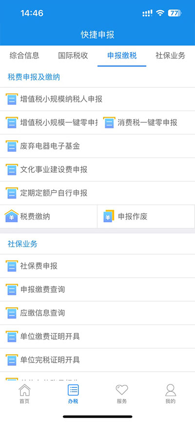 吉林移动办税app内置了社保业务、快捷申报、申报缴税、国际税收、查询中心等服务,还可随时查询当前办税进度以及结果,让办事进度更加公开透明,无需担心业务无人处理,也不用担心线下排队等待和通勤时间过长的问题。除此之外吉林移动办税app更是提供了多种常见的税务服务,以及可以办理一系列的税务业务,方便用户进行办税操作,有需要的用户可以在本站免费下载体验!