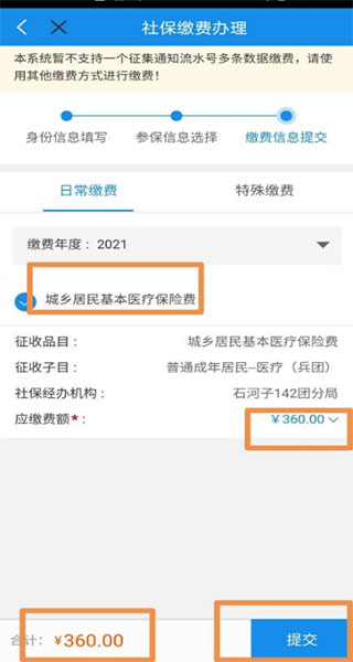 6、点击“下一步”,页面跳转到【缴费信息提交】页面;可选择“日常申报和特殊缴费”两种模式。