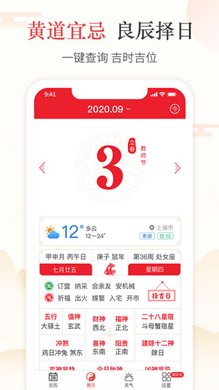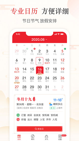 1、全方位的生活服务,吉日选择、天气预报、传统节气等一目了然;2、页面简洁,不冗余,凸显中国传统元素,做优秀准确的中国万年历;