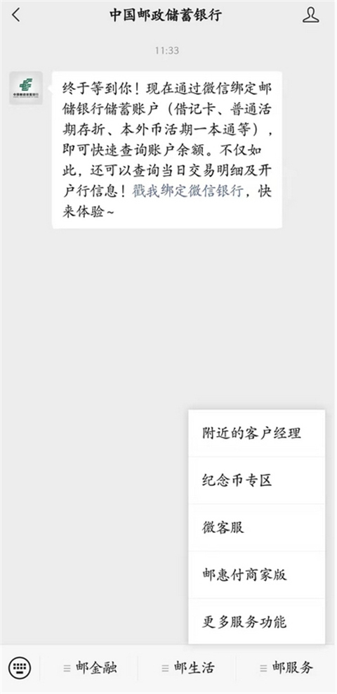 1、用户需要使用微信关注【中国邮政储蓄银行】公众号,然后聊天页面右下角找到【邮服务】并点击;