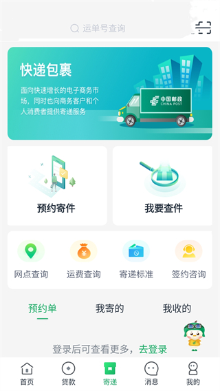 4、在寄递栏可以预约寄件、查看及网点查询等功能。