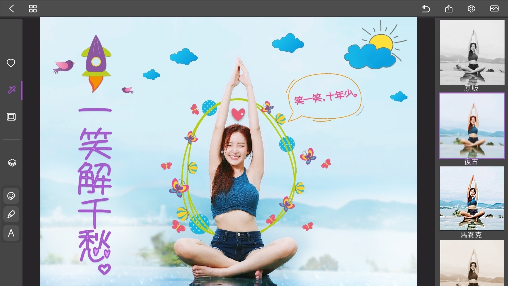 可以帮助用户通过点击屏幕编辑图片。包含印章,神奇的笔触效果,充满活力的相框,以及画刷。同时具有裁剪功能,可以剪切照片中所需的部分。用户还可以导入和导出照片。