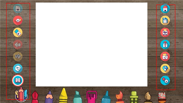 可以让孩子们体会到绘画的乐趣、可以使用儿童绘画台中的印章,3D画刷和明亮的颜色。所有的刷子和橡皮大小均可以改变。孩子们可以同时一边听音乐一边体验魔杖的绘画风格。
