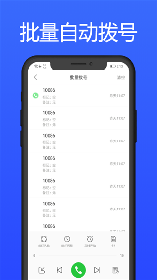 拨号多多app是一款功能强大实用性极强的自动拨号软件,能够轻松实现电话号码的自动外呼,适用场景非常广,能够用于电销、日程安排、定时提醒、早觉唤醒、业务安排、电话客服等非常多的场景,实用性极强,非常好用。同时软件使用起来也十分简单,相当易上手,只需将需要拨打的号码添加进软件当然后设置拨打次数、拨打时间、拨打间隔即可,系统会根据你设置的选项自动按时拨打。此外对于那些从事电销的用户们来说单个输入大量的号码十分的麻烦,因此拨号多多当中有智能导入的批处理功能能够对其提供帮助,它能够自动识别EXCEL表格和TXT文本文档,将其中大量的电话号码自动导入到软件当中,非常的方便,能够为其节省大量的时间,提升工作效率。