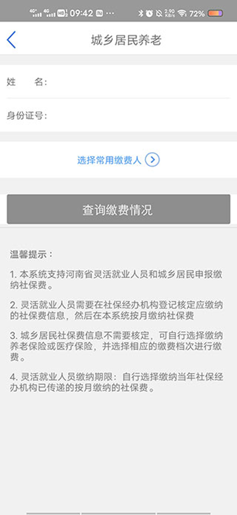 4、输入自己的身份证号码与姓名,选择查询缴费情况,即可在线缴纳养老保险。如果是给家人缴纳养老保险的话,选择常用缴纳人。