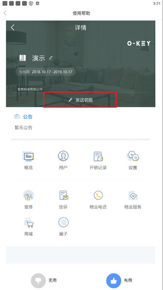 如果电子钥匙身份为“管理员“或“业主钥匙”,则“发送钥匙”按钮会显示可用;