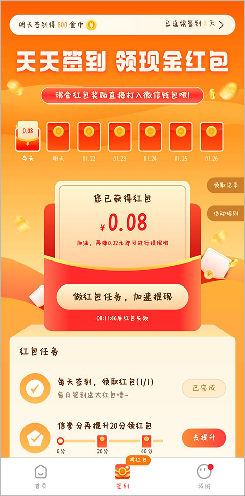 4、签到页面除了可以签到,下方还有很多红包任务;