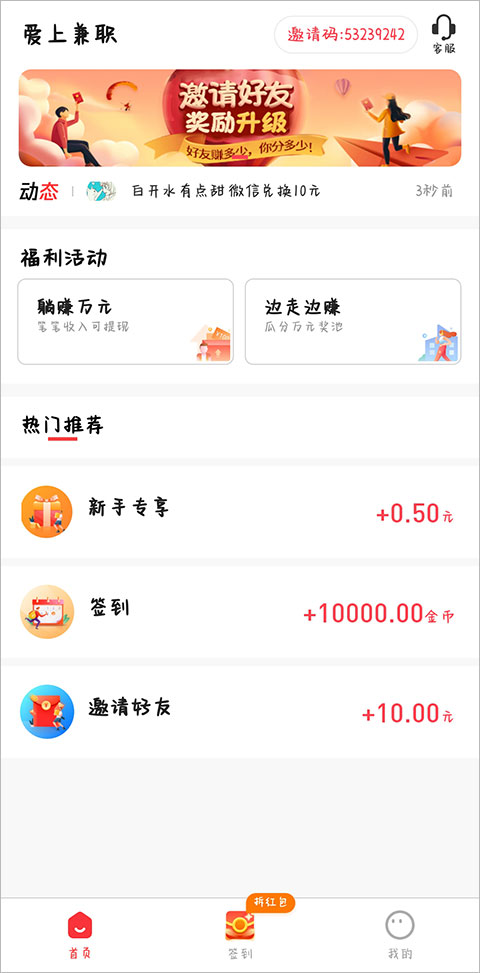 首次登陆爱上兼职可领取现金红包,随时可提现。