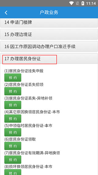 4、选择户政业务后。我们往下滑找到办理居民身份证,根据你需要的服务联系,选择相应的服务,例如居民身份证领取、居民身份证丢失异地补办领取或者是北京市首次申领居民身份证。