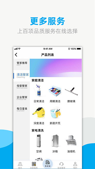 2、全部服务中心,包含清洁管家、母婴管家、企业管家、每日星食服务,下拉选择你需要清洁的;