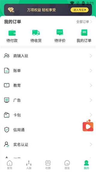 5、点击我的,有商铺入驻,账单,教育,广告,卡包,信用通,红星,直播等功能。